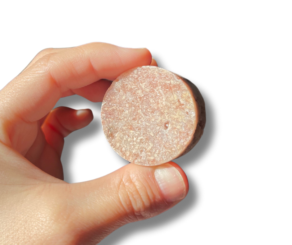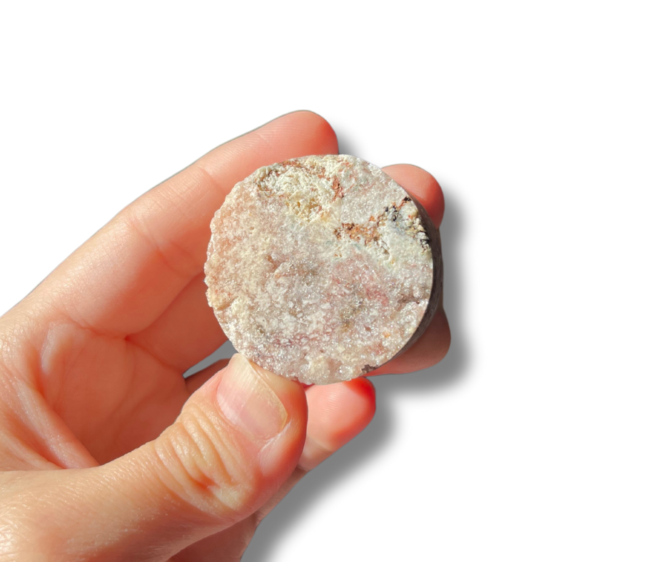 Pink amethyst disc with druzy top, side, and half polished, flat bottom.