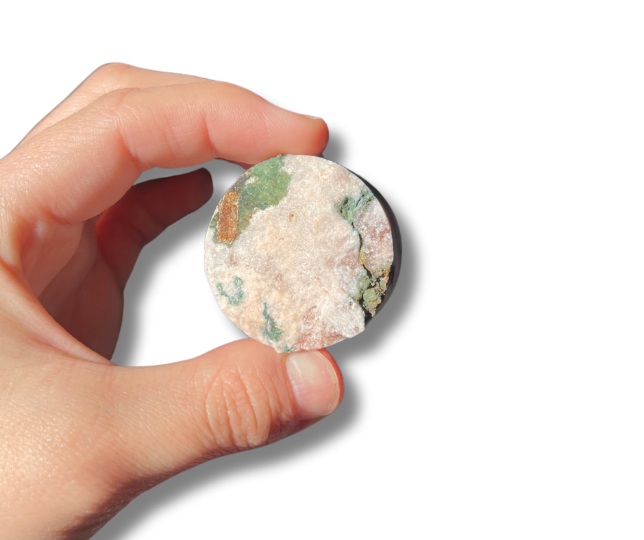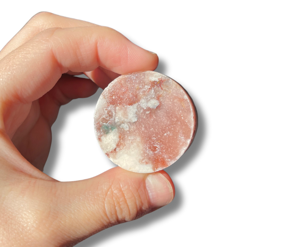 Pink amethyst disc with polished top and unpolished and flat bottom.