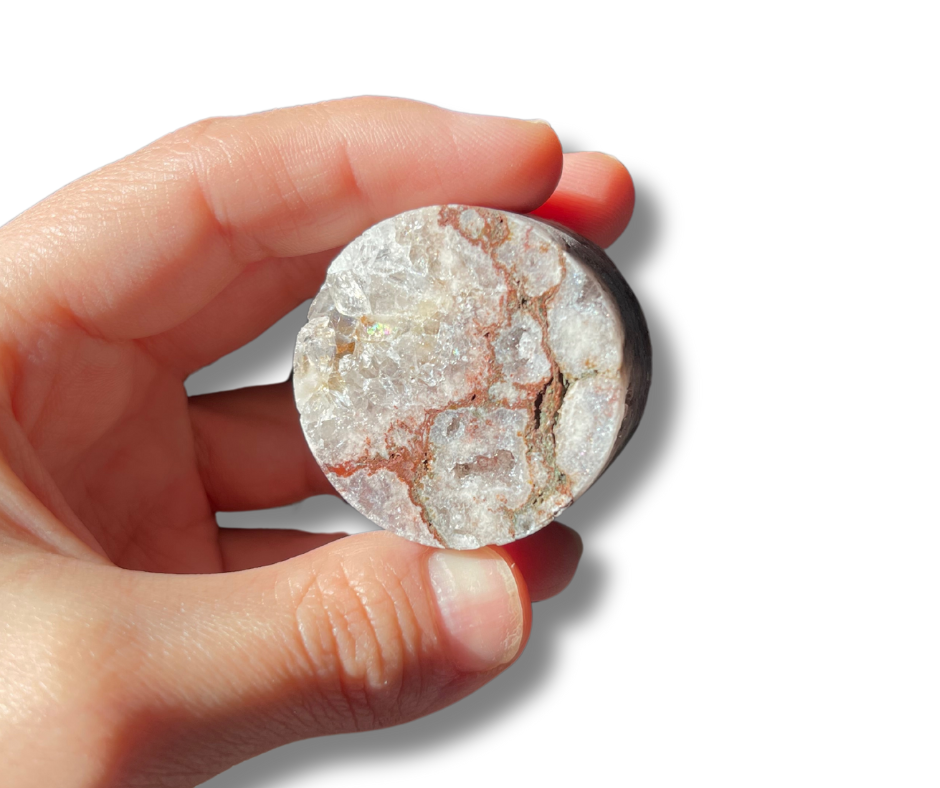 Pink amethyst disk with druzy. Polished top and flat, unpolished bottom.