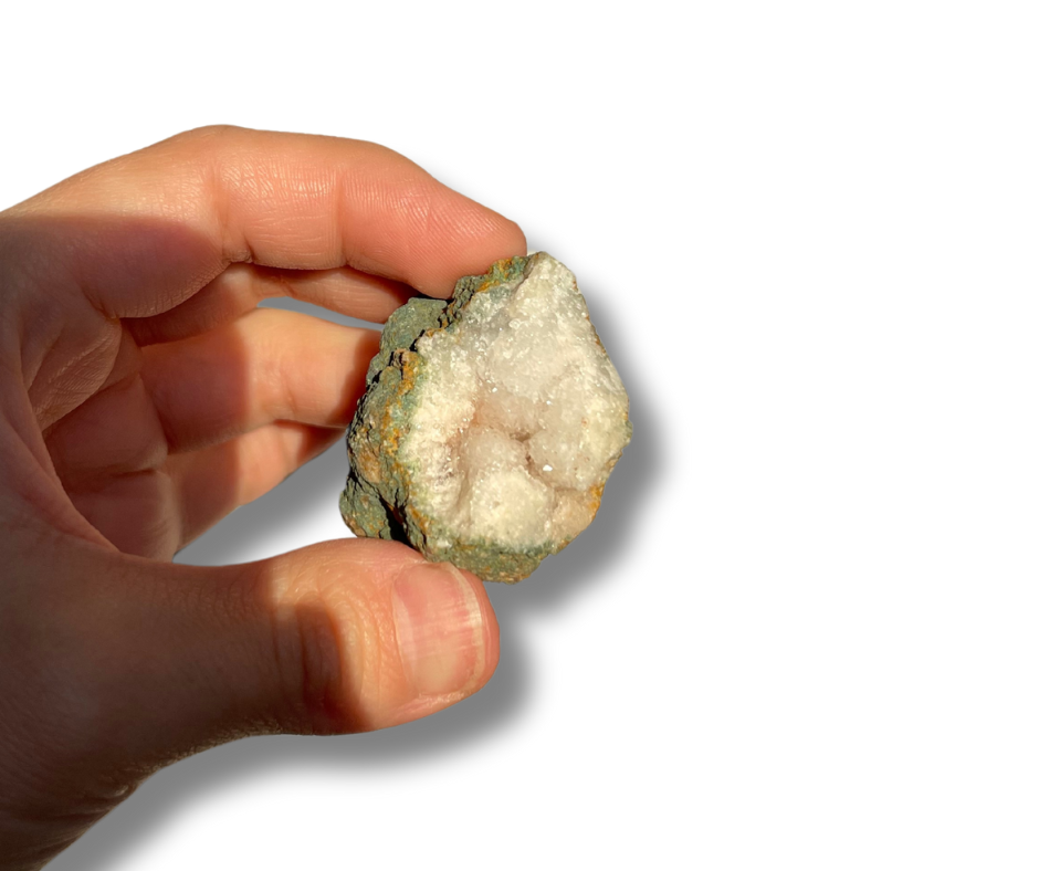 Pink amethyst geode with snow druzy and white color profile.