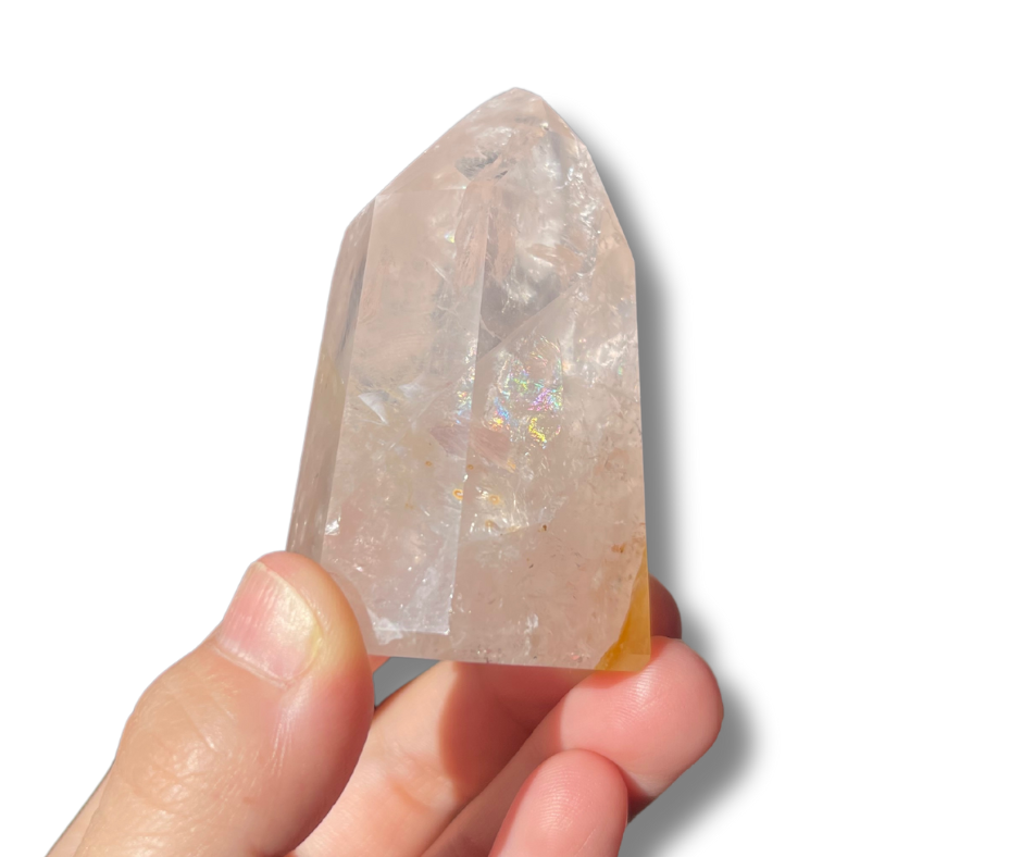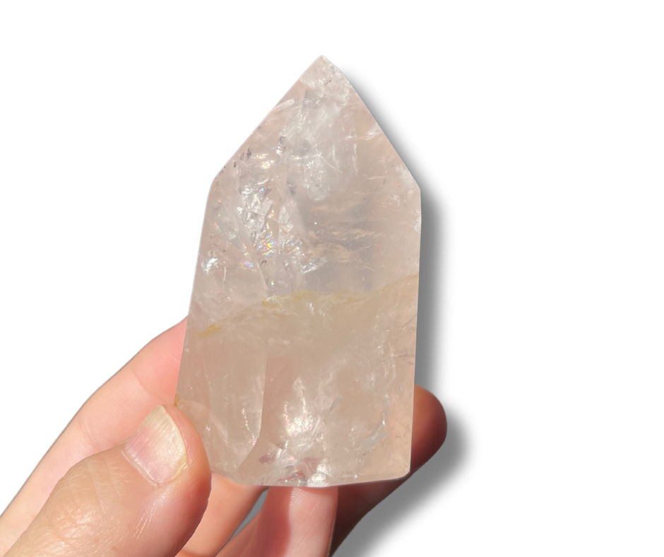 Gemmy Rose Quartz tower with golden healer inclusions and rainbows.